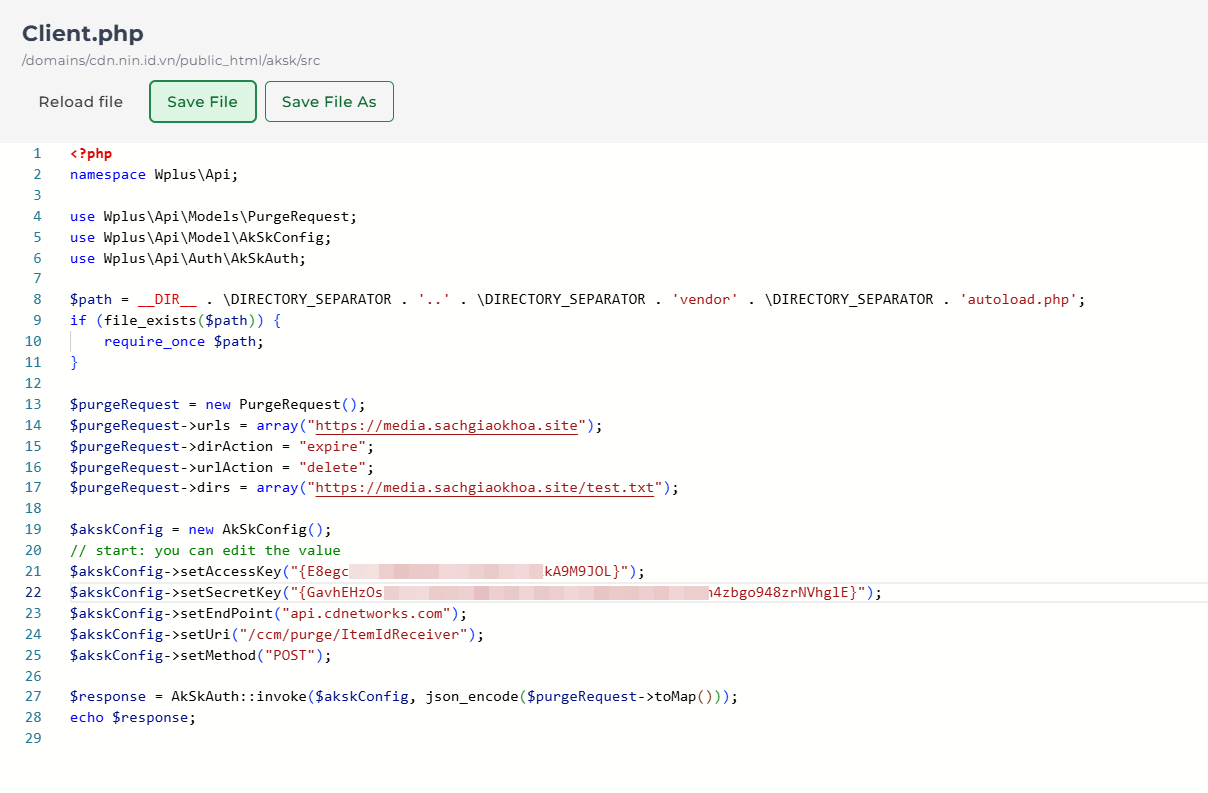 Tiến hành thay thế {accessKey} và {secretKey} vào trong file Client.php