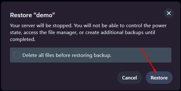 Để tiến hành restore backup ta quay lại tab Backups và chọn vào file backup cần restore