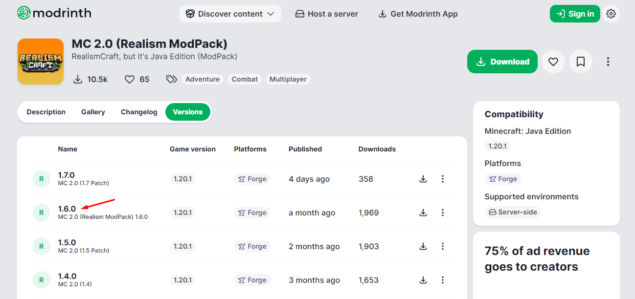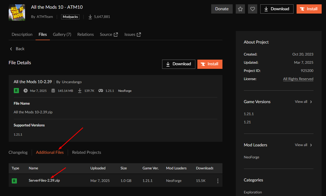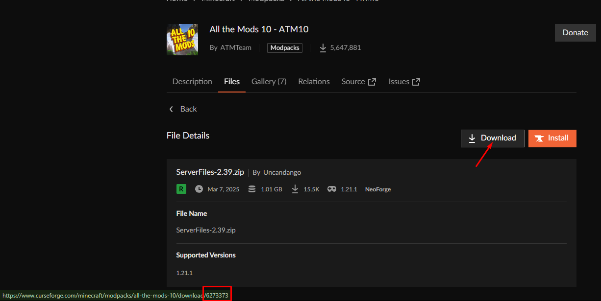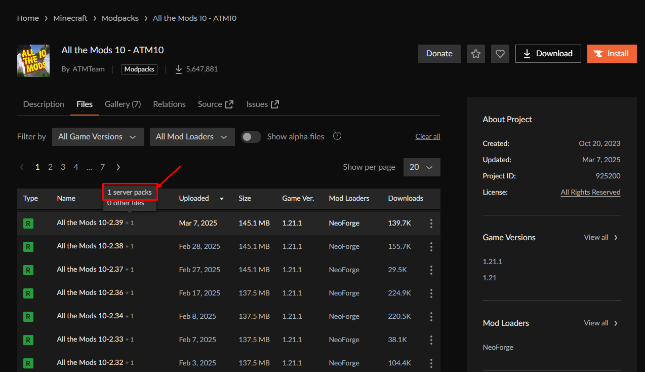 Lưu ý: Nên kiểm tra xem phiên bản của modpack có hỗ trợ phiên bản cho server hay không trước khi cài đặt. (Thường là có chữ +1 ở các phiên bản)