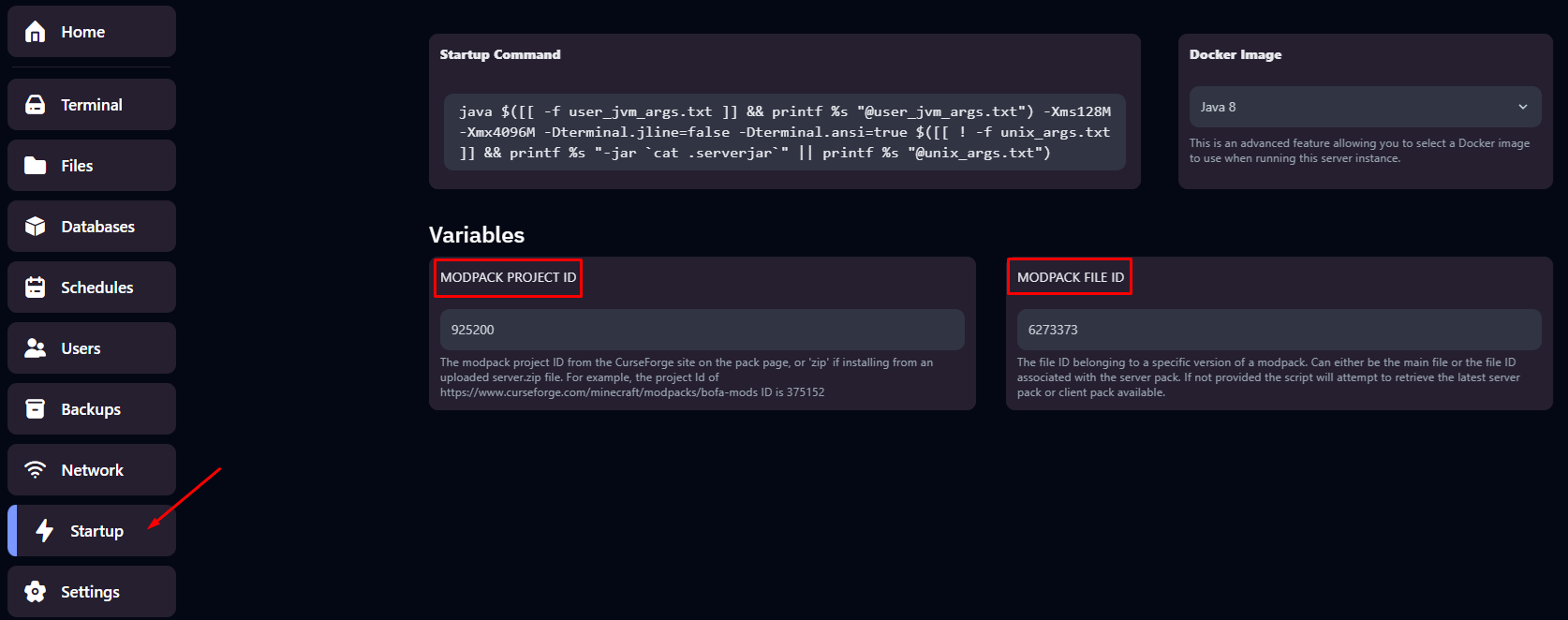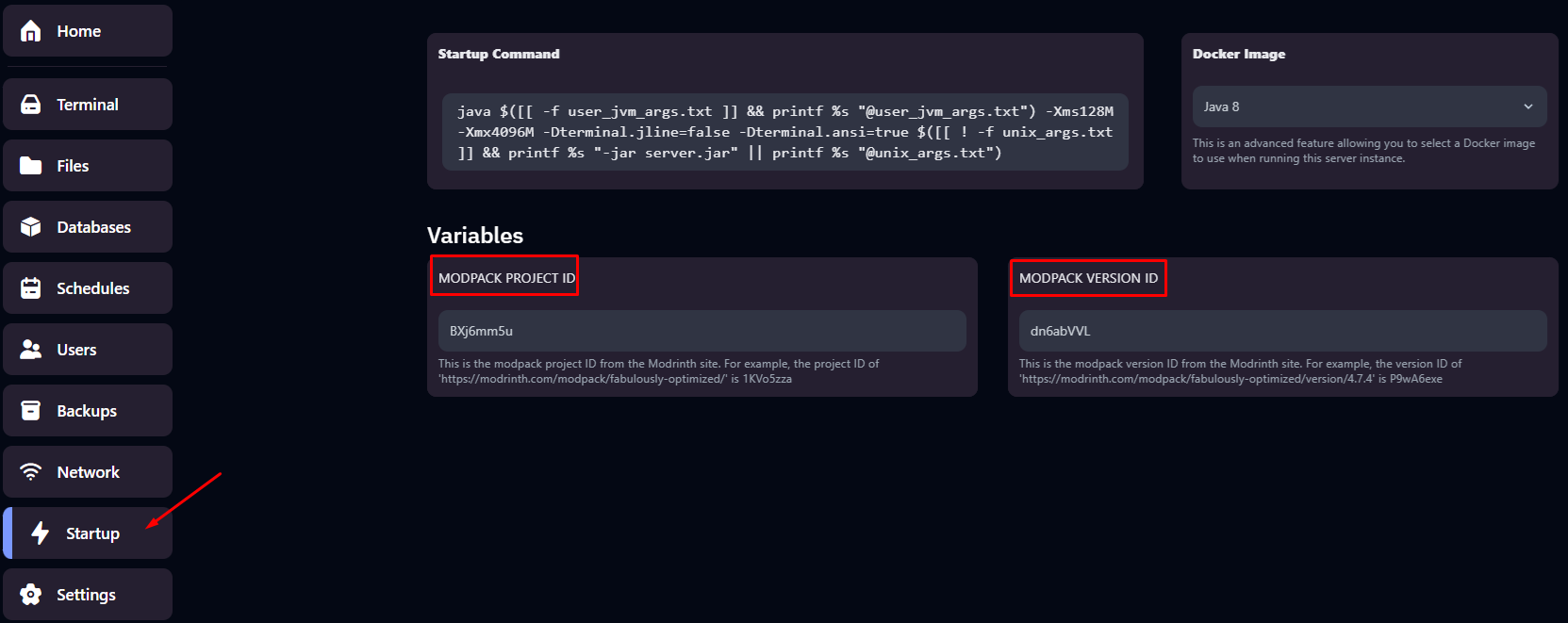 Sau khi liên hệ với kỹ thuật viên (email về support@vinahost.vn hoặc chat thông qua livechat VinaHost-LiveChat) để chuyển đổi server (Modrinth), đăng nhập vào Panel quản lý Server Minecraft, chọn vào mục Startup