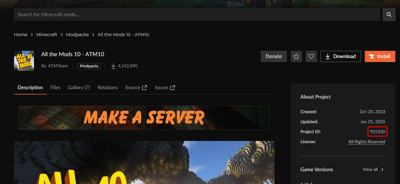 Đối với Modpack Project ID, ta sẽ thao tác như sau: