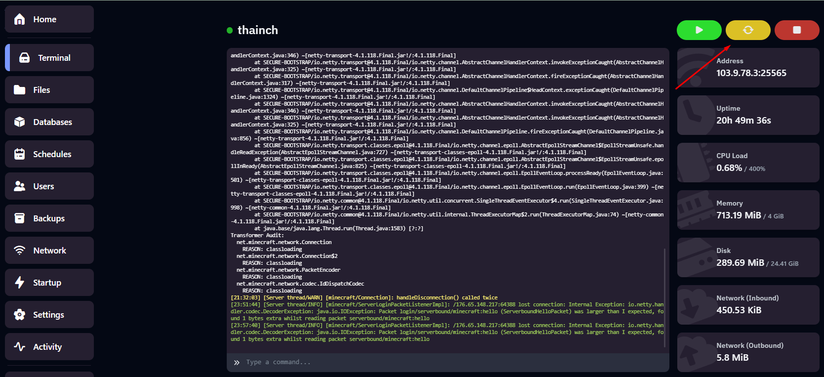 Sau khi hoàn tất upload, ta quay lại tab Console và chọn Restart Server