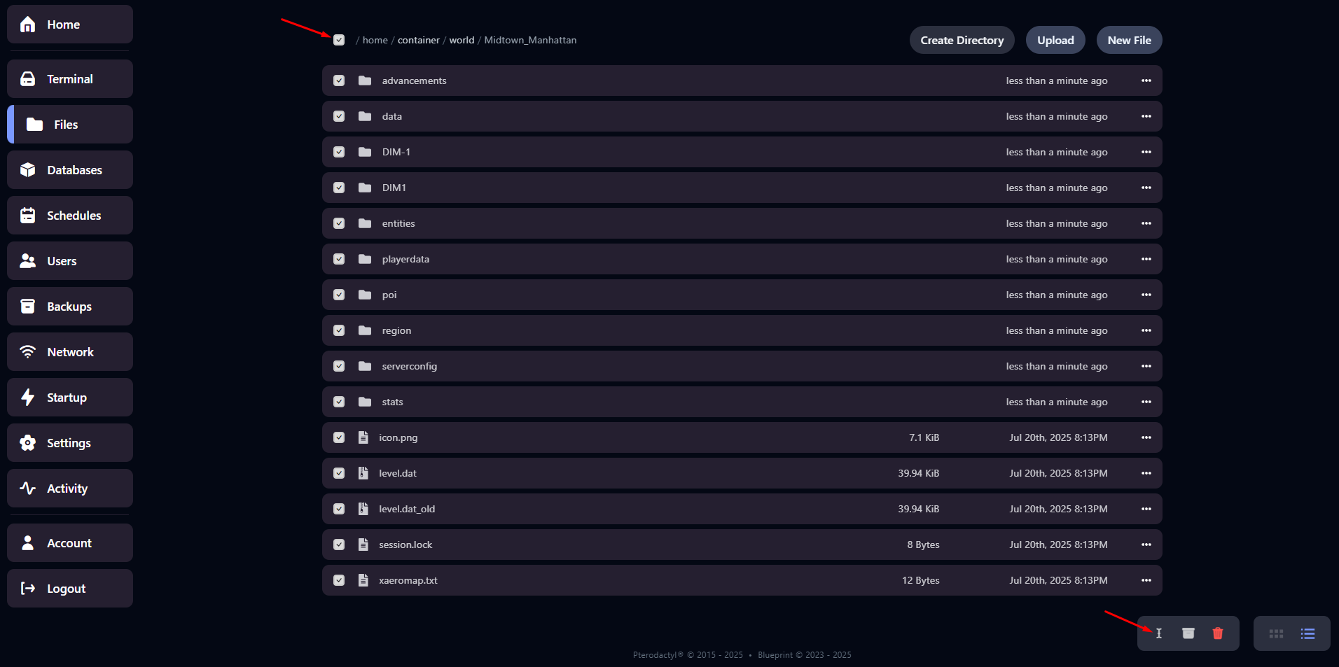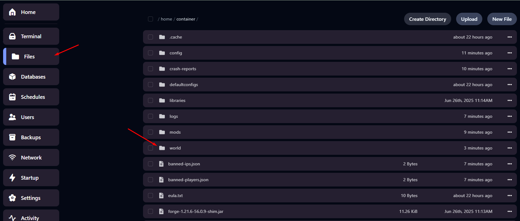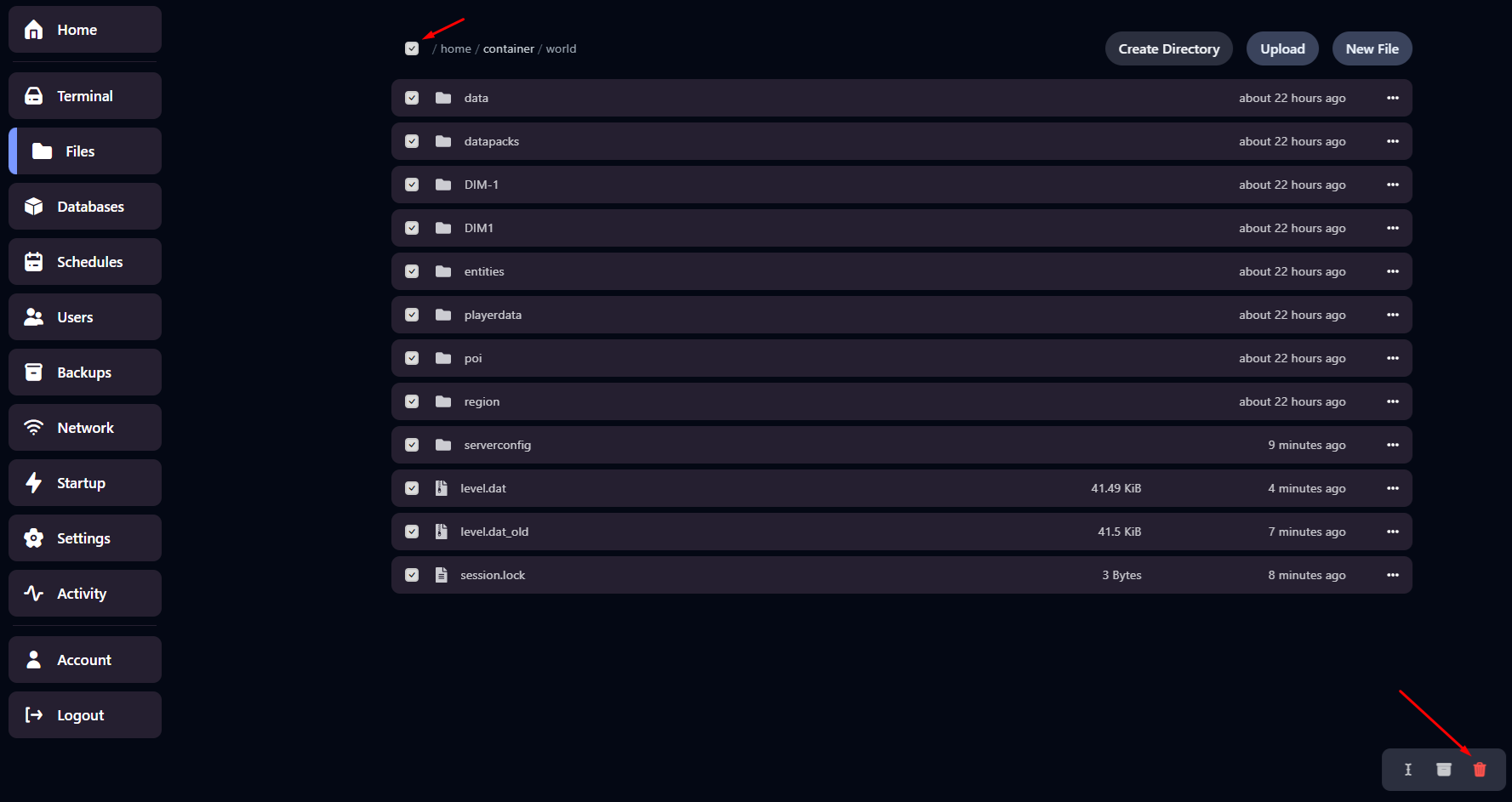 Sau khi server tắt, ta di chuyển qua tab Files và xóa nội dung trong thư mục world