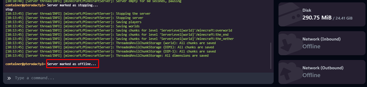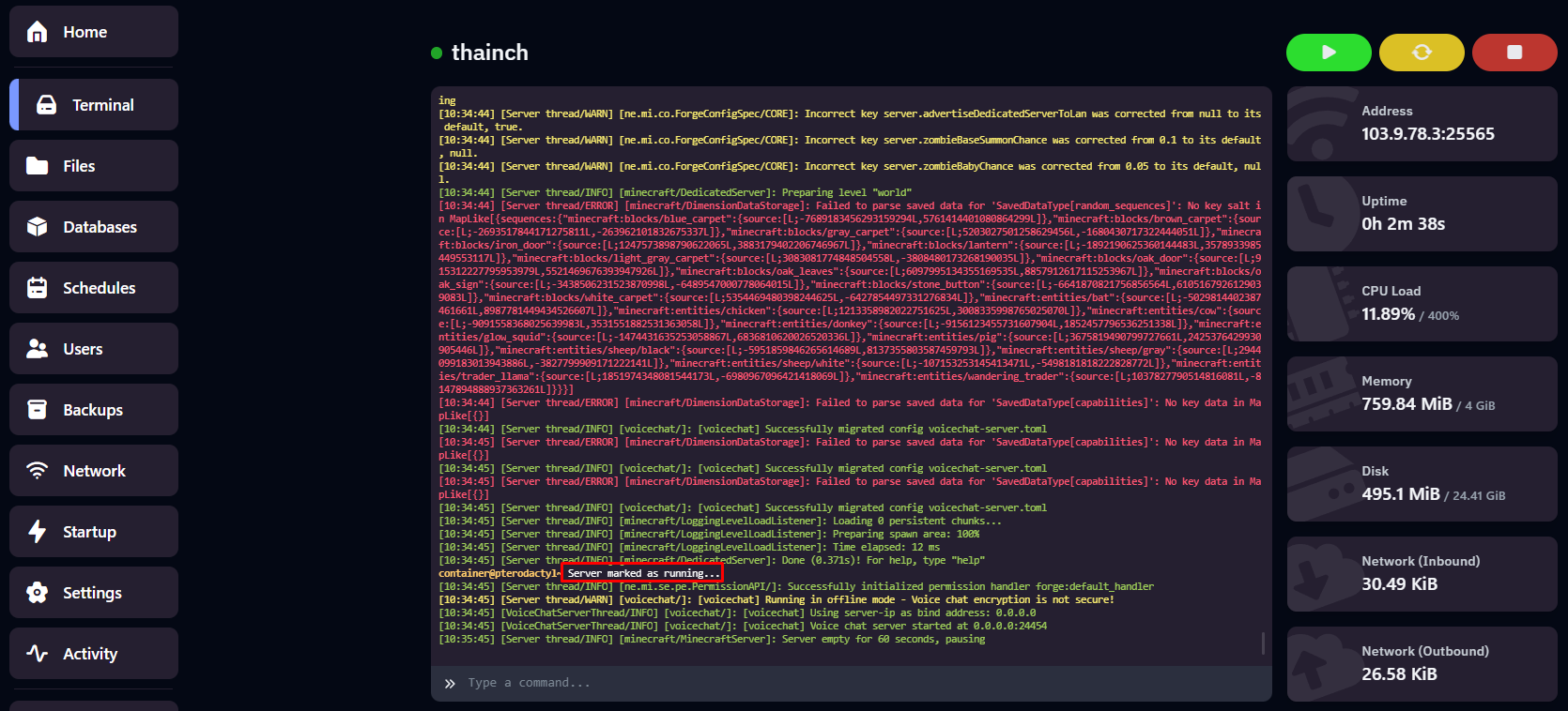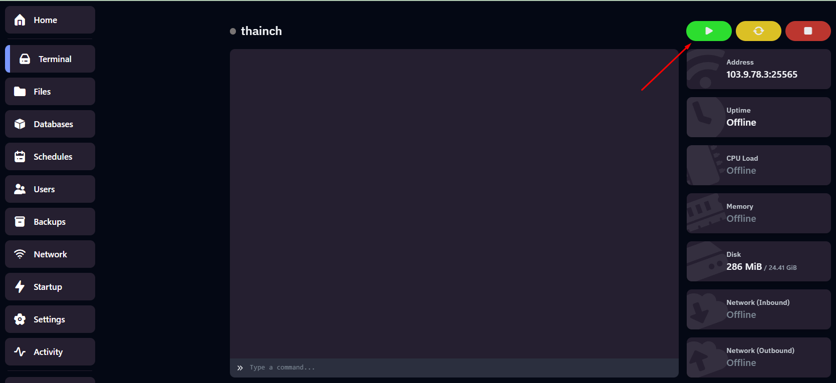 Ta đăng nhập vào Panel và nhấn Stop để tắt server